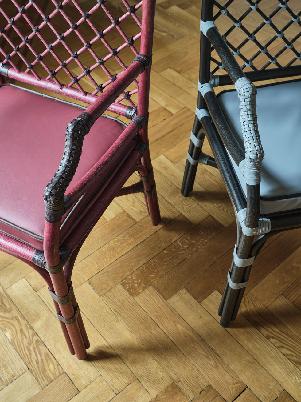 Poltroncina capotavola con braccioli di colore Rosso Burgundy con legature in cuoio marroni e cuscino in pelle Rosso Burgundy.
